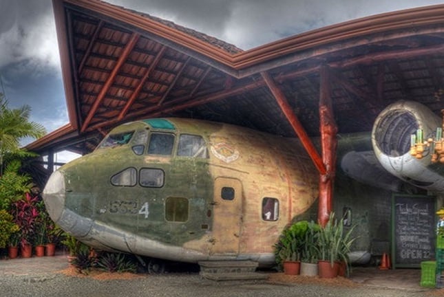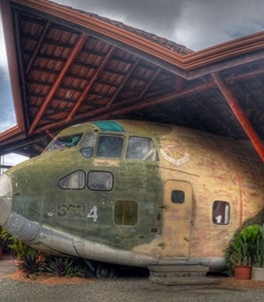 En agosto de 2000, compramos el Fairchild abandonado y enviamos las piezas de la reliquia Irán-Contra a Quepos. ¡El fuselaje se envió en ferry oceánico porque tenía 10 pulgadas demasiadas de ancho para los anticuados puentes del ferrocarril Chiquita Banana! Después de subir siete tramos por el cerro Manuel Antonio, la C-123 finalmente encontró su actual lugar de descanso junto al acantilado.